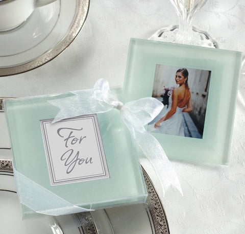 Capture the moment in classic glass. This gorgeous frosted glass frame coaster gift set will protect your memories of your wedding forever. Crafted from heavy high quality frosted glass, each coaster wedding favour features four padded "feet" to protect surfaces. Present your wedding guests with these lovely gifts in any number of ways: framing a photo of the happy couple, used as a place card holder, inserted with a personalised tag of your name and wedding date or simply displaying our beautiful 'Thank You' tag already inserted. Your wedding guests will love being able to take these wedding favours home and use the coasters to frame their own special photos! The gift set consist out of two coasters and is presented to your wedding guests in a clear gift box. The gift box is tied with a sheer organza ribbon and has a 'Thank You' tag attached. These stunning coaster gift sets will add a useful touch of glass to any wedding reception table or bridal shower. (Coasters measures approximately 8.9x8.9cm and fit photos approximately 5.08x2.54cm). Sold as a set of two coasters