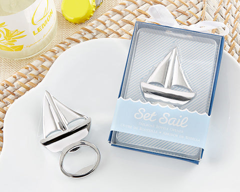 Nautically speaking, a sailboat, a bottle opener, and a cooler full of thirst-quenching, bottled beverages are all thats needed for a day of fun at sea. With this sailboat and bottle opener, your guests are more than halfway there!Features and facts:Gleaming chrome-finished metal sailboat atop a bottle openerClear display gift box is backed with blue and white stripe and has a belly band to make it appear the sailboat is riding the wavesGift box measures approx 7.6cm h x 6.35cm w