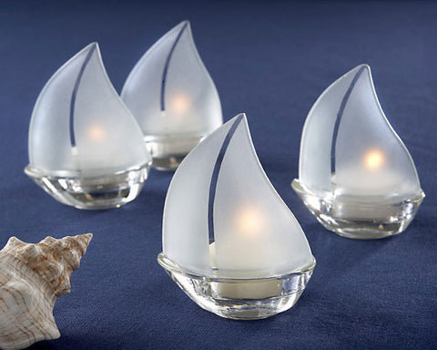 Set Sail with this nautical-themed sailboat wedding favors. These little lights will give the required ambiance to your tables decorSeaside or beach wedding gift or table decor. Or if you are lucky to have a boat wedding, sail away with these perfect favours!More details:Frosted glass sailboat tea light holders each measure 7.6 cm x 8.9 cm.Minimum order Quantity of 4Tea candles are included